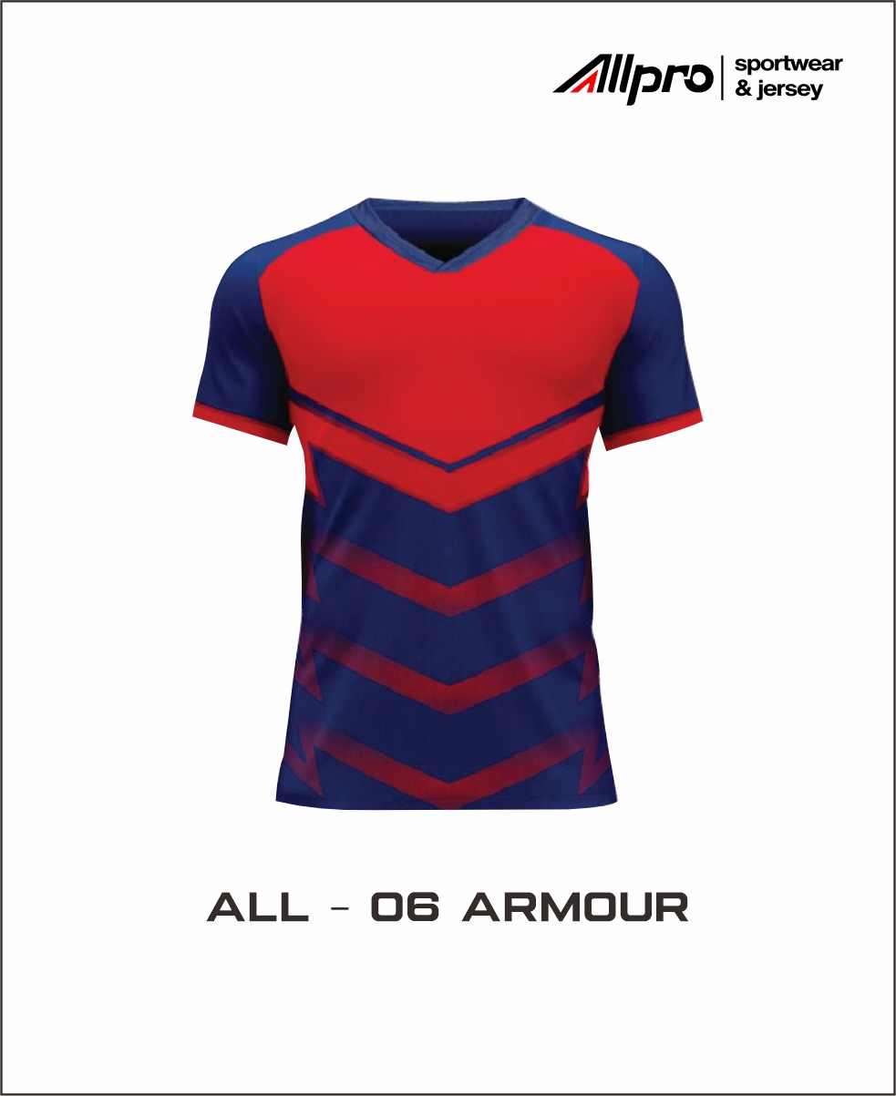 Kaos jersey dengan warna dasar merah kombinasi graffiti tameng biru keunguan